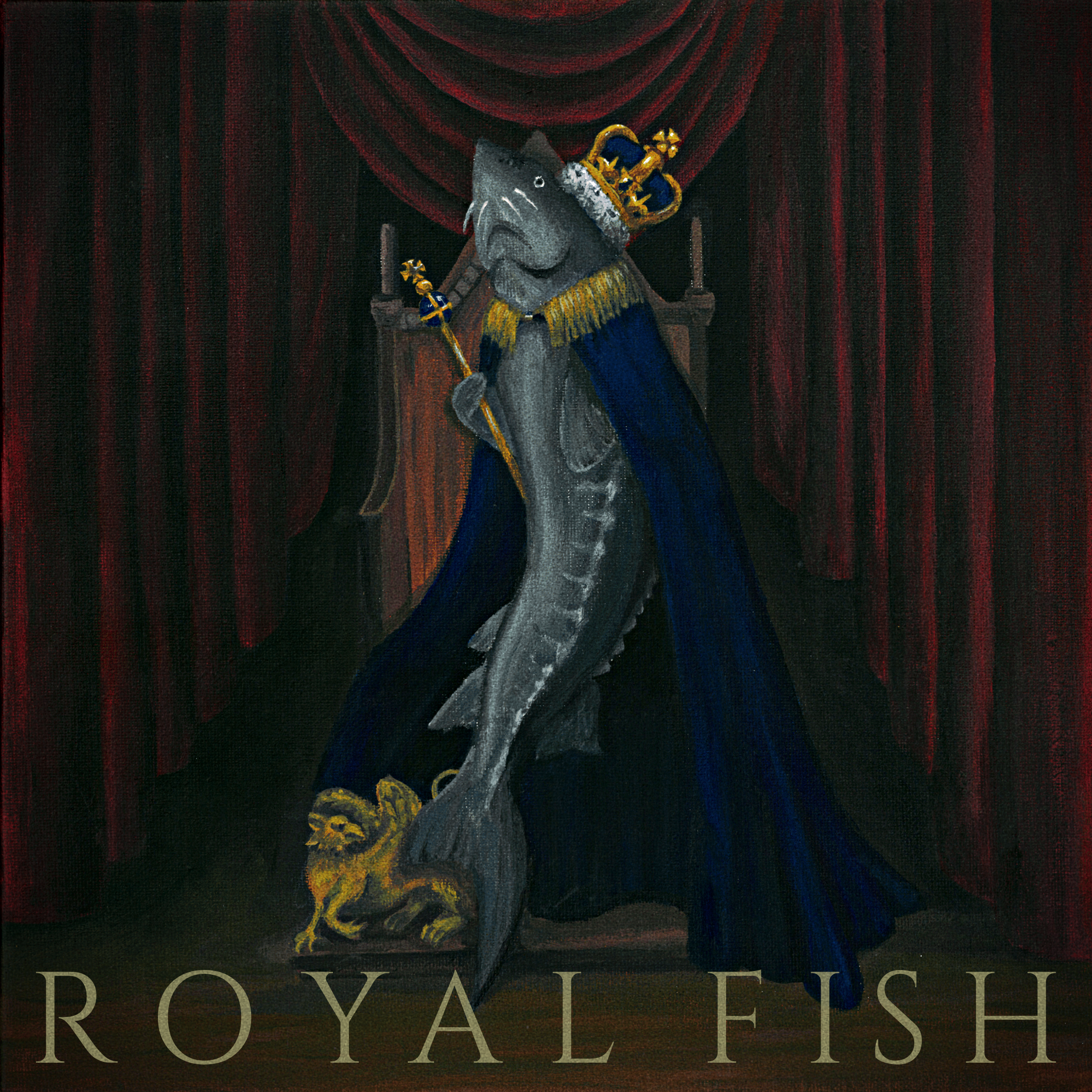 The album cover was painted by Emily on a 12x12 canvas. It is a realistic depiction of the Royal Fish mascot, King Fish. He is a European Sturgeon. The fish is dressed in a blue cape with gold fringe and wears a crown similar to that of the crown jewels of the United Kingdom. He is seated on a throne that mimics the English coronation chair, although the gilded lions at the bottom are replaced by the William & Mary griffin.